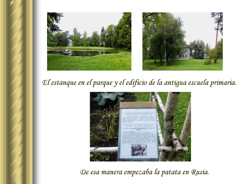 El estanque en el parque y el edificio de la antigua escuela primaria.De esa manera empezaba la patata en Rusia.