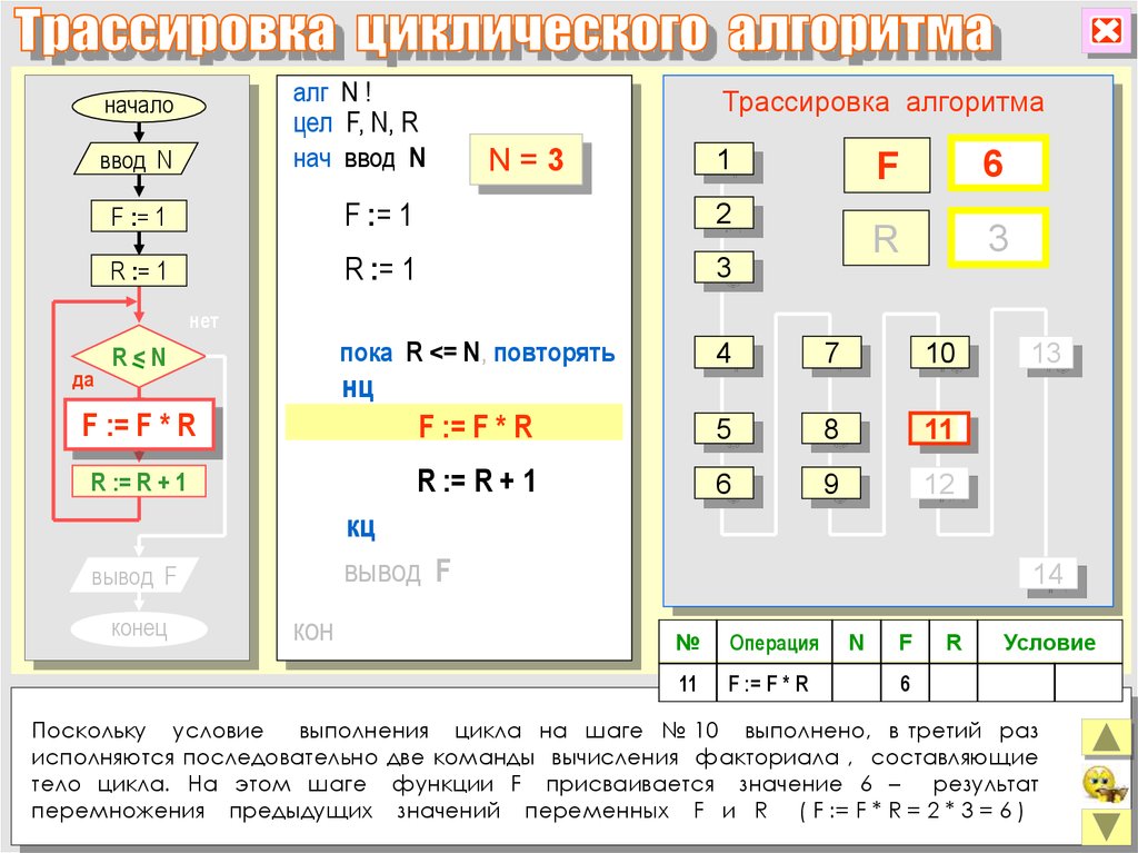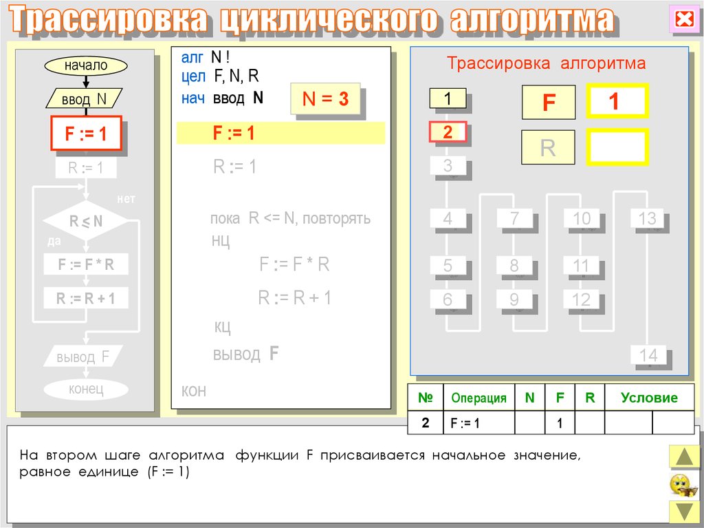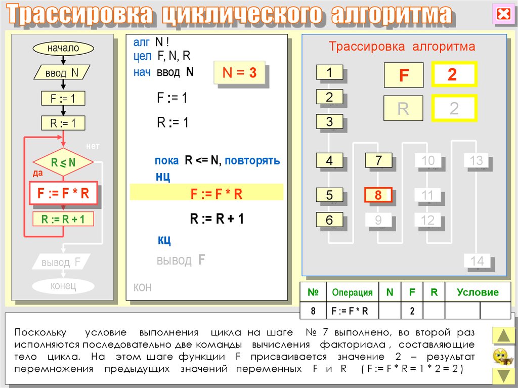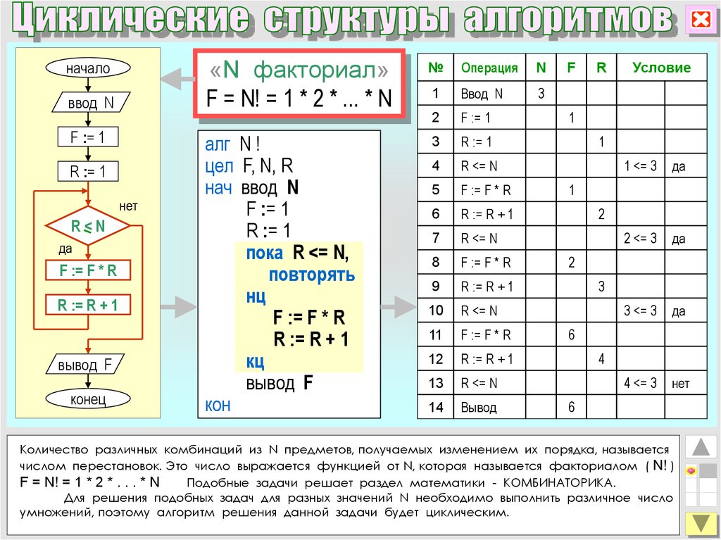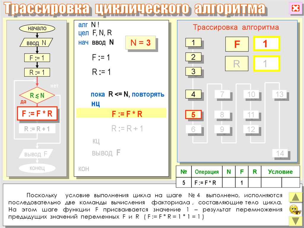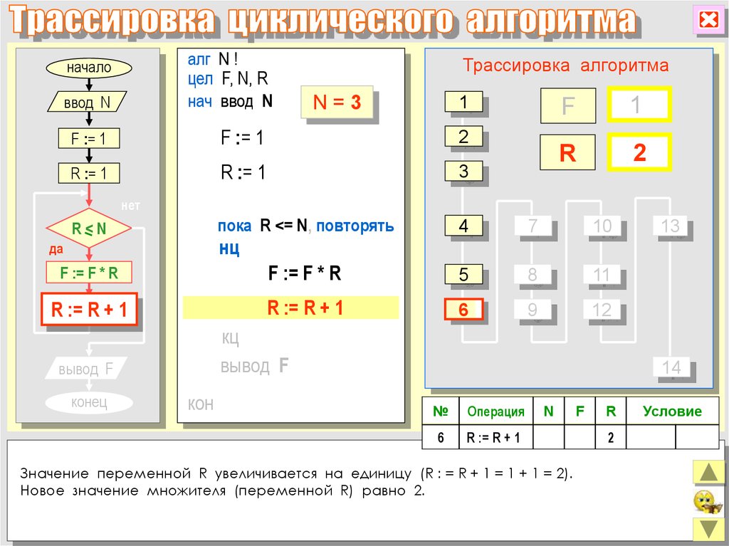 перемножения предыдущих значений переменных F и R ( F := F * R = 2 * 3 = 6 )