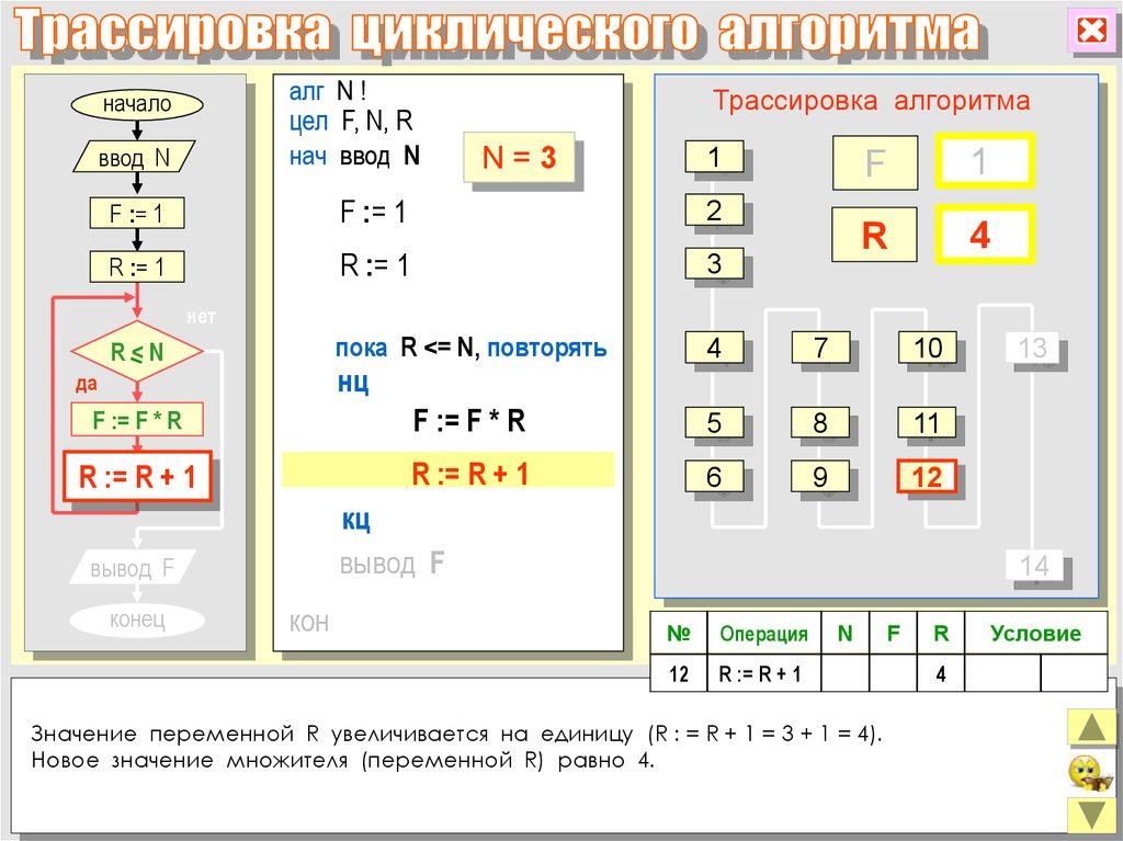 Значение переменной R увеличивается на единицу (R : = R + 1 = 3 + 1 = 4).