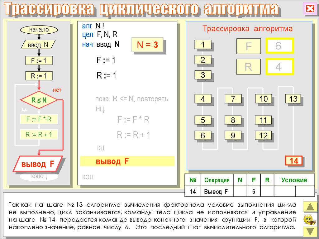 Так как на шаге № 13 алгоритма вычисления факториала условие выполнения цикла