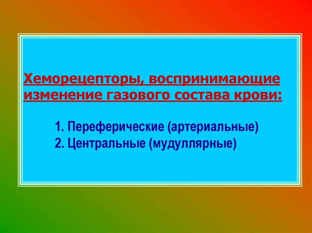 43. Хеморецепторы, воспринимающие изменение газового состава крови: 1. Переферические (артериальные) 2. Центральные (мудуллярные)