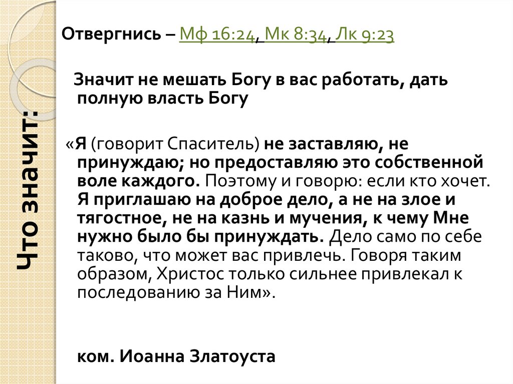 Отвергнись – Мф 16:24, Мк 8:34, Лк 9:23Что значит: