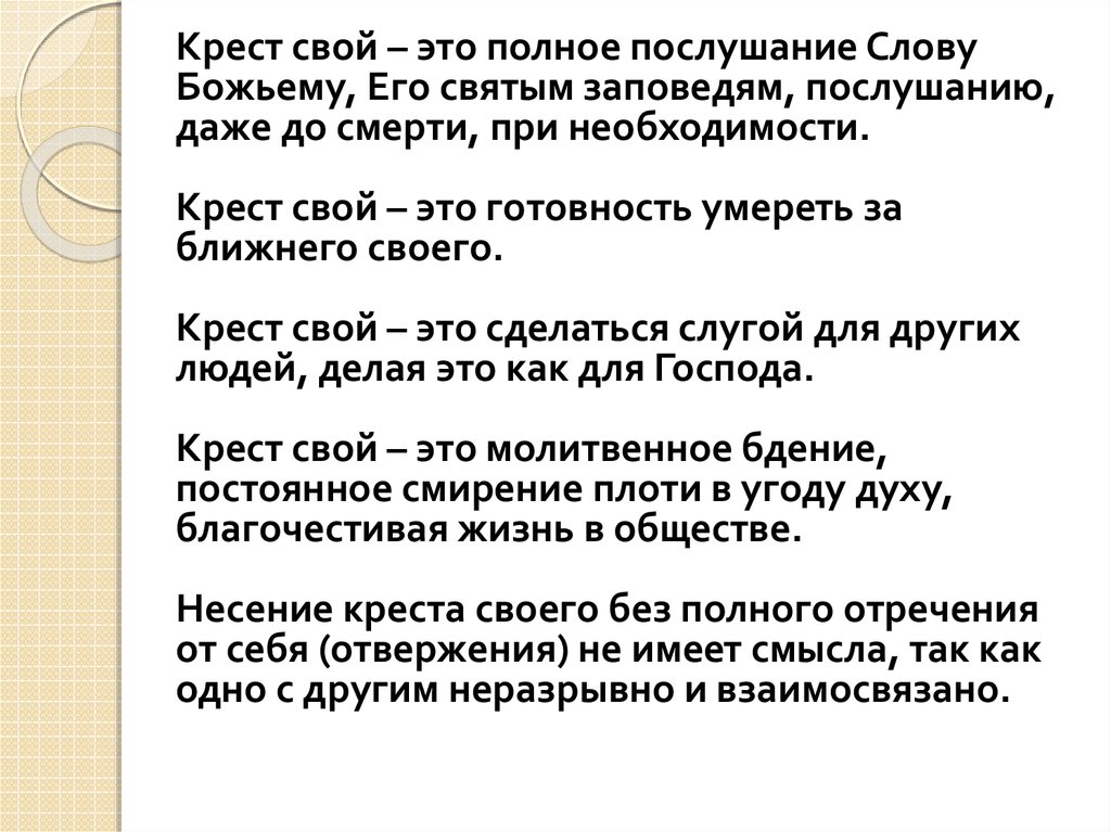 Крест свой – это полное послушание СловуБожьему, Его святым заповедям, послушанию,