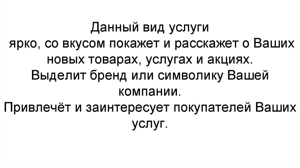 Данный вид услугиярко, со вкусом покажет и расскажет о Ваших