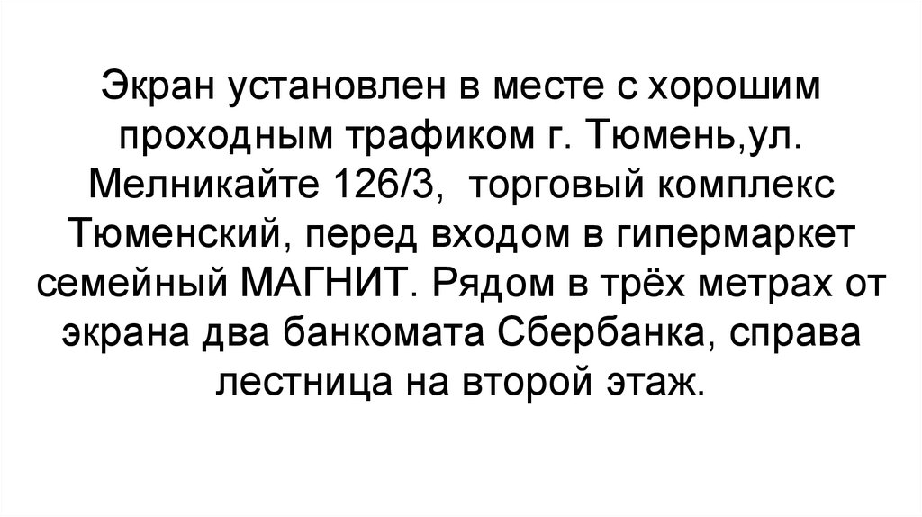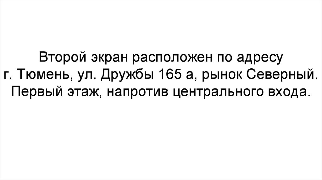 Второй экран расположен по адресуг. Тюмень, ул. Дружбы 165 а, рынок Северный.