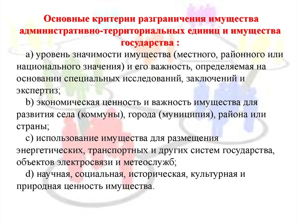 Основные критерии разграничения имуществаадминистративно-территориальных единиц и имущества