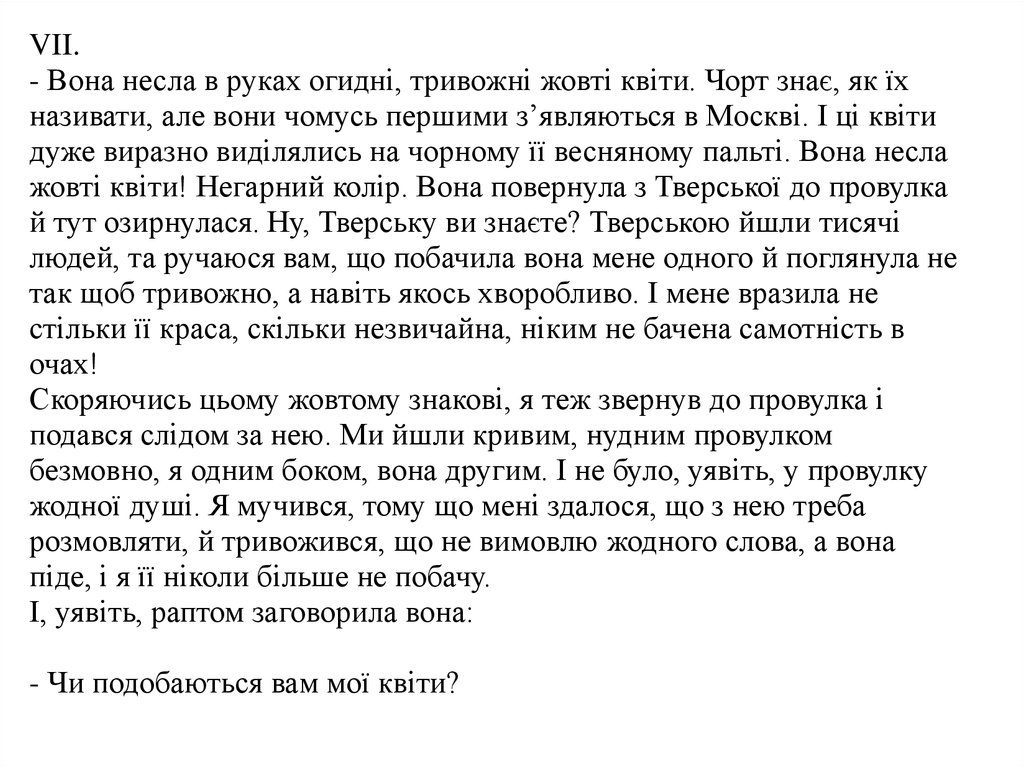 VII.- Вона несла в руках огидні, тривожні жовті квіти. Чорт знає, як їх