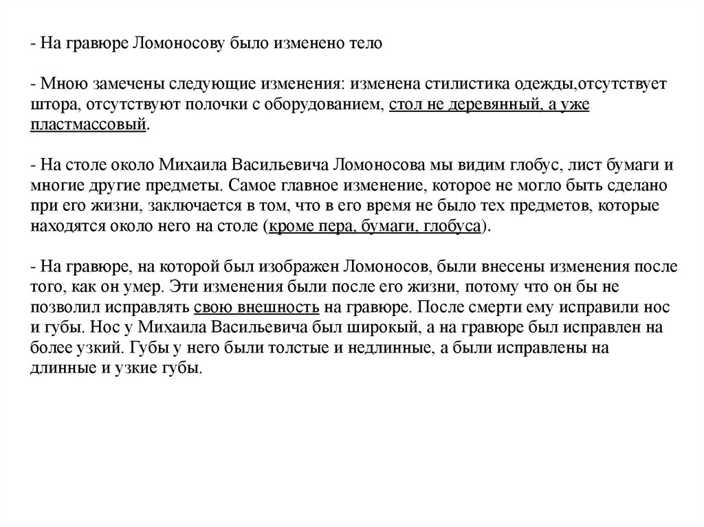 - На гравюре Ломоносову было изменено тело- Мною замечены следующие изменения: изменена стилистика одежды,отсутствует