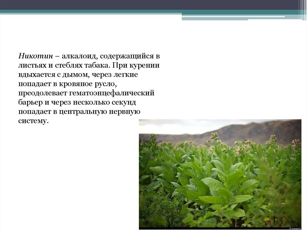 Никотин – алкалоид, содержащийся влистьях и стеблях табака. При курении