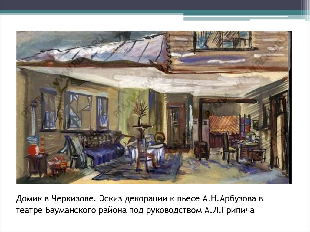 Домик в Черкизове. Эскиз декорации к пьесе А.Н.Арбузова втеатре Бауманского района под руководством А.Л.Грипича