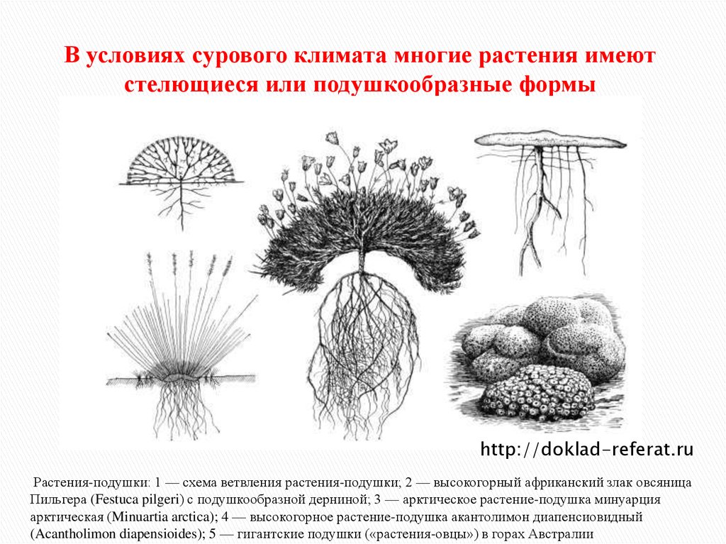 В условиях сурового климата многие растения имеютстелющиеся или подушкообразные формы