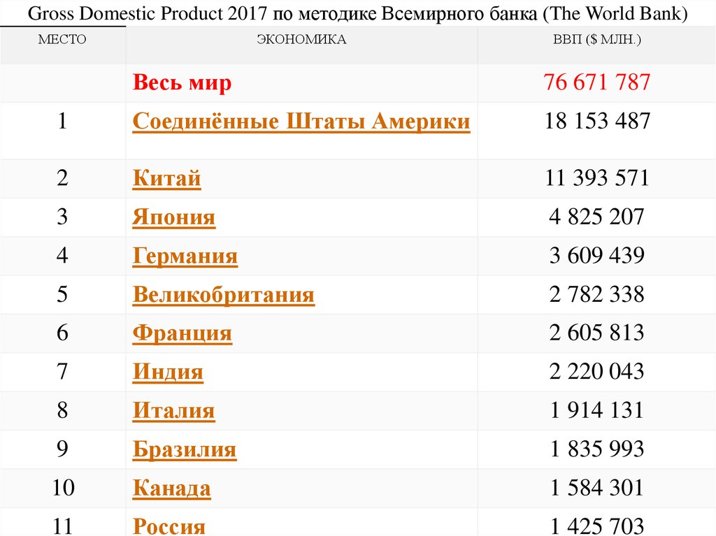 Gross Domestic Product 2017 по методике Всемирного банка (The World Bank)МЕСТО