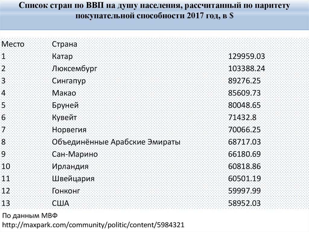 Список стран по ВВП на душу населения, рассчитанный по паритетупокупательной способности 2017 год, в $