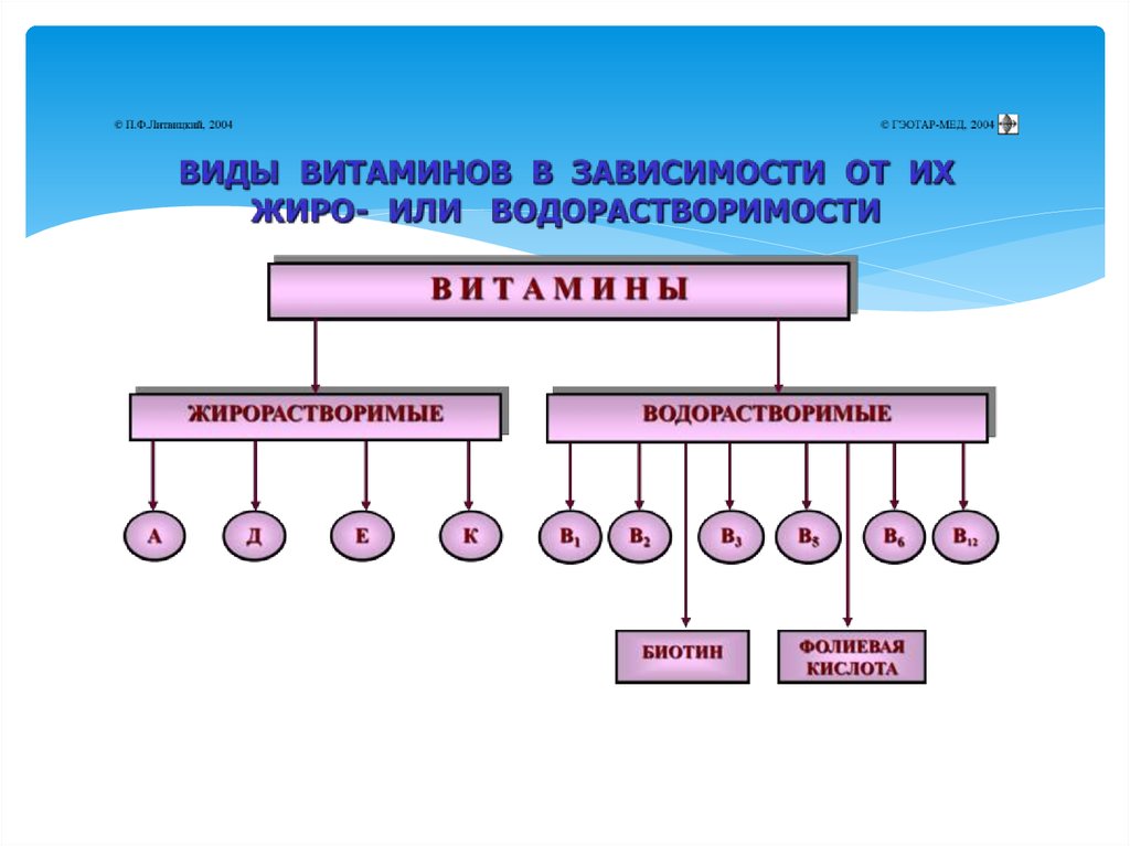 Витамины делятся на жирорастворимые (A, D, E, F, K) и