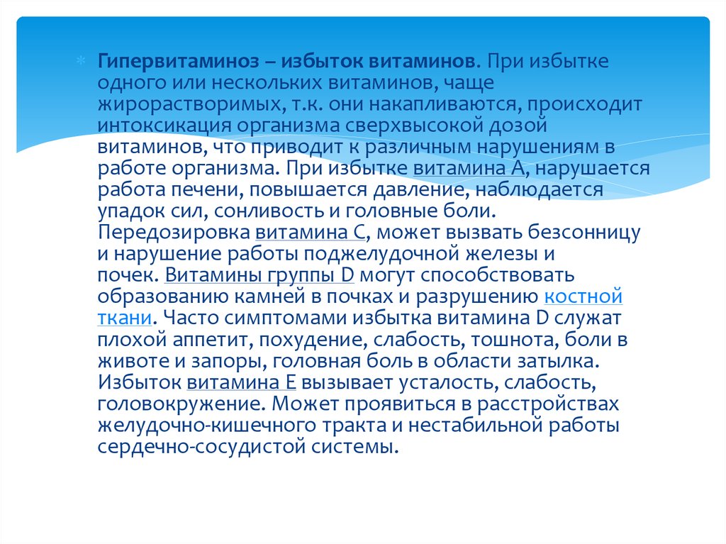 Гипервитаминоз – избыток витаминов. При избыткеодного или нескольких витаминов, чаще