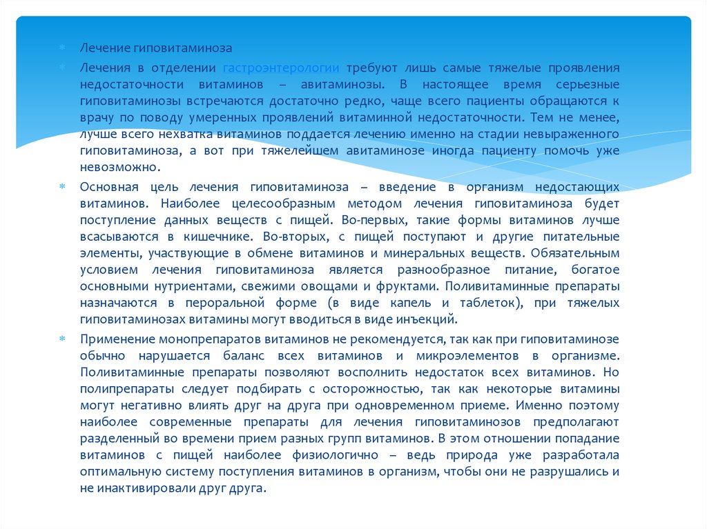 Применение монопрепаратов витаминов не рекомендуется, так как при гиповитаминозе