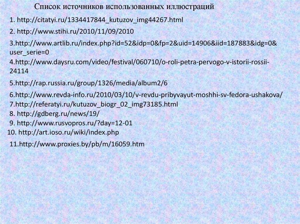 Список источников использованных иллюстраций1. http://citatyi.ru/1334417844_kutuzov_img44267.html