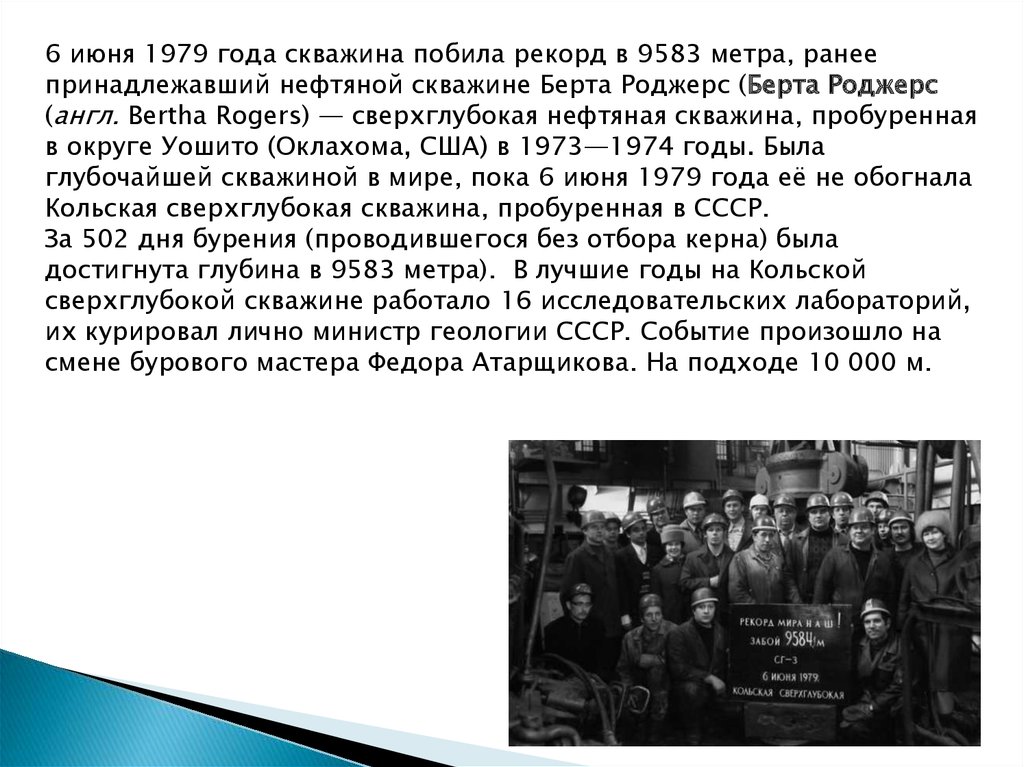 глубочайшей скважиной в мире, пока 6 июня 1979 года её не обогнала