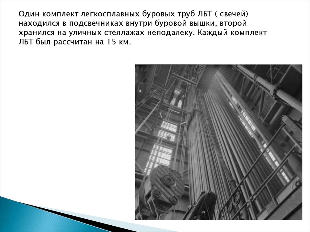 Один комплект легкосплавных буровых труб ЛБТ ( свечей)находился в подсвечниках внутри буровой вышки, второй