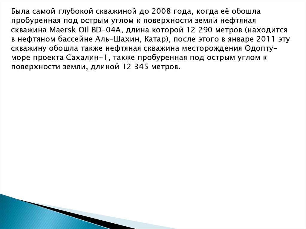 Была самой глубокой скважиной до 2008 года, когда её обошлапробуренная под острым углом к поверхности земли нефтяная