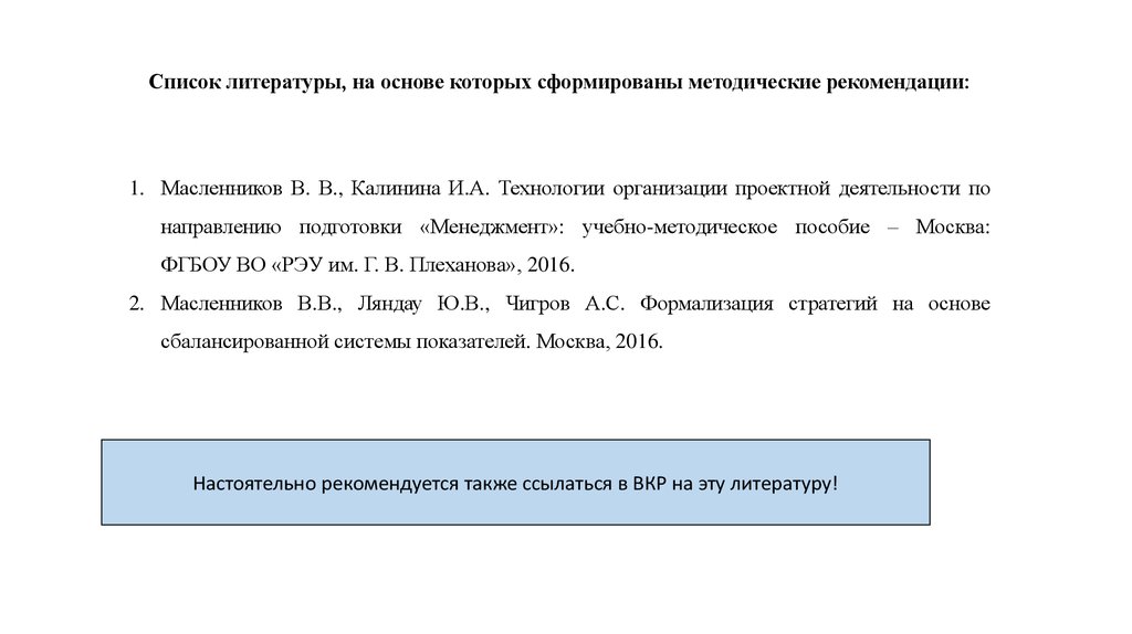Список литературы, на основе которых сформированы методические рекомендации:1. Масленников В. В., Калинина И.А. Технологии организации проектной деятельности по