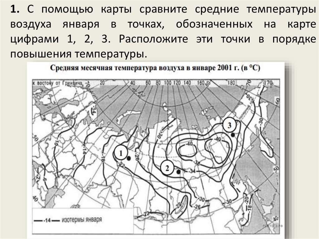 1. С помощью карты сравните средние температурывоздуха января в точках, обозначенных на карте