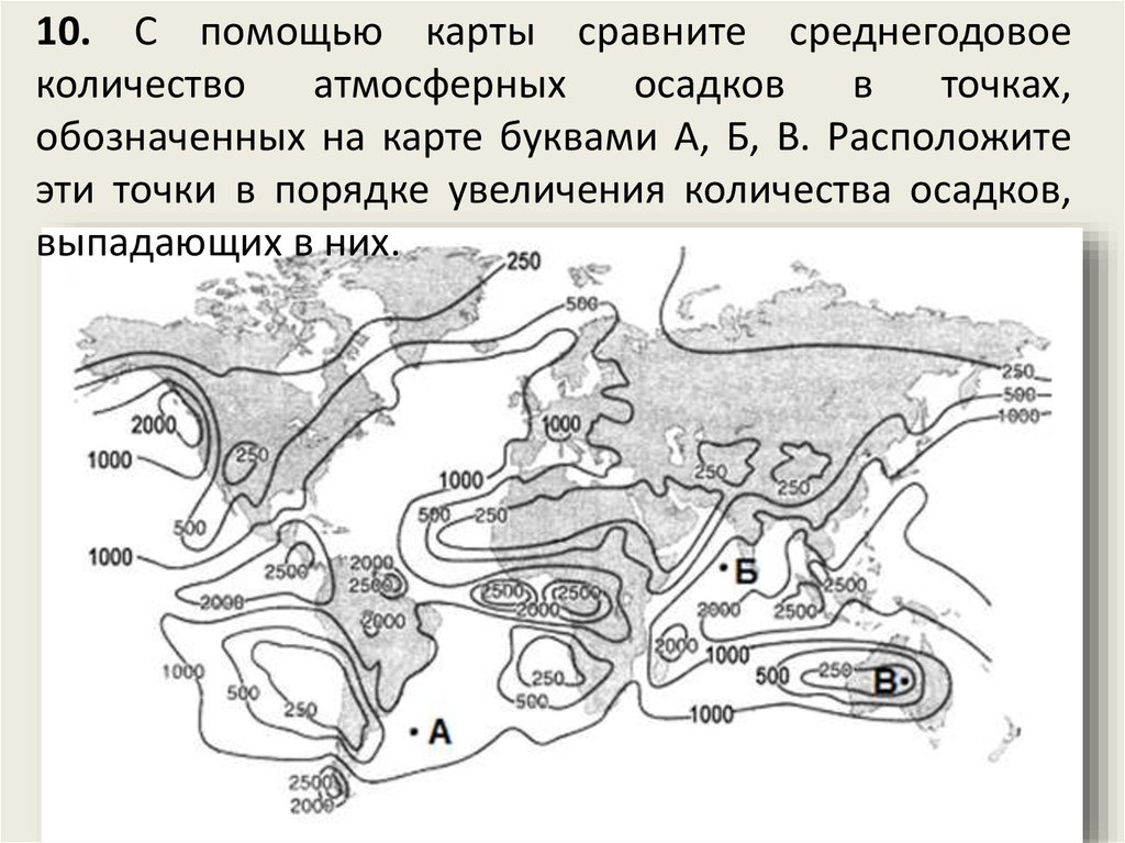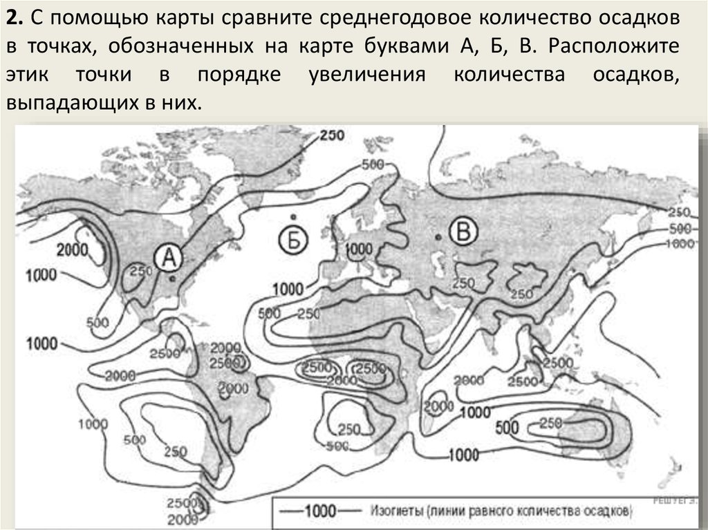 2. С помощью карты сравните среднегодовое количество осадковв точках, обозначенных на карте буквами А, Б, В. Расположите