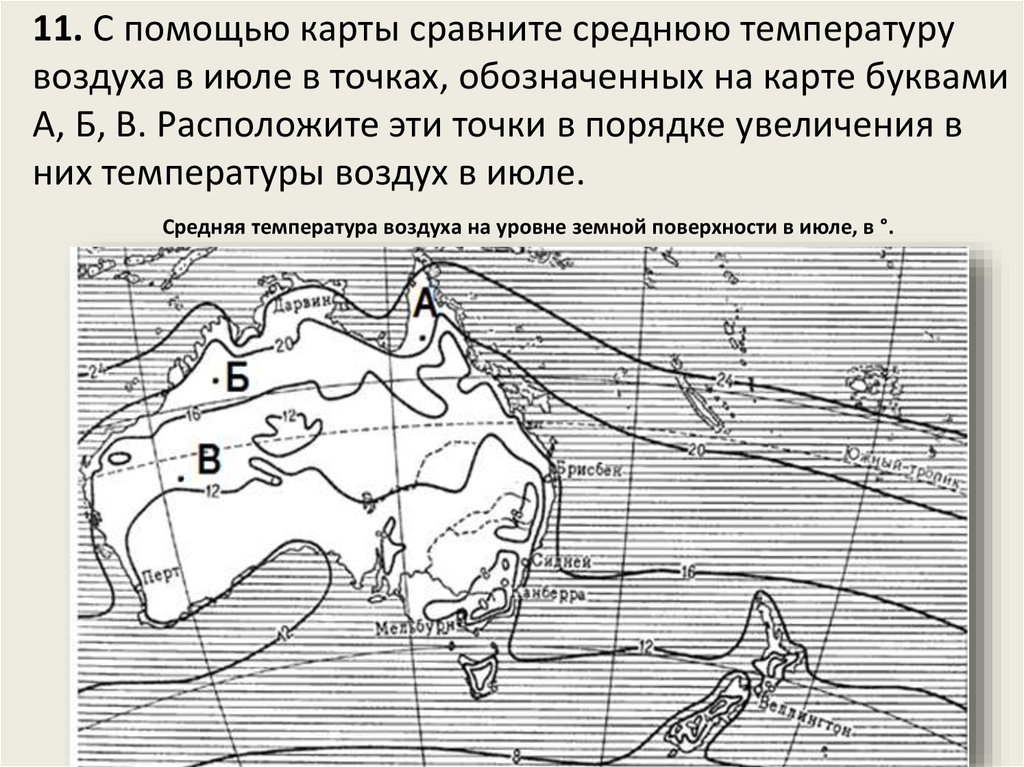 11. С помощью карты сравните среднюю температурувоздуха в июле в точках, обозначенных на карте буквами