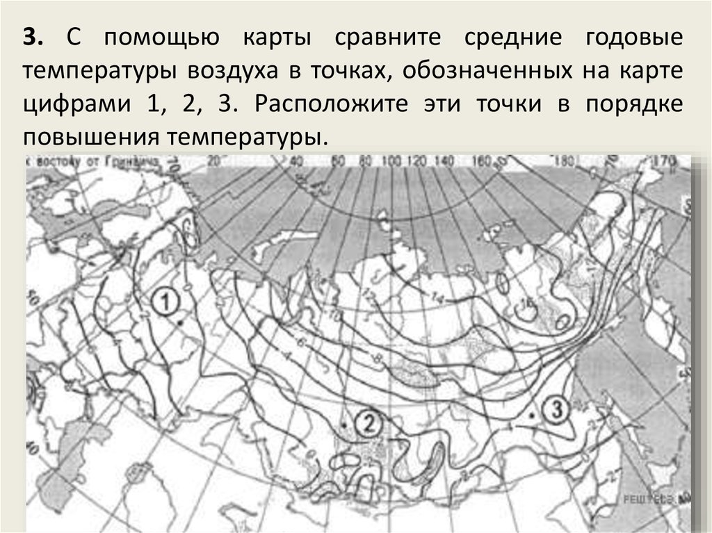 3. С помощью карты сравните средние годовыетемпературы воздуха в точках, обозначенных на карте