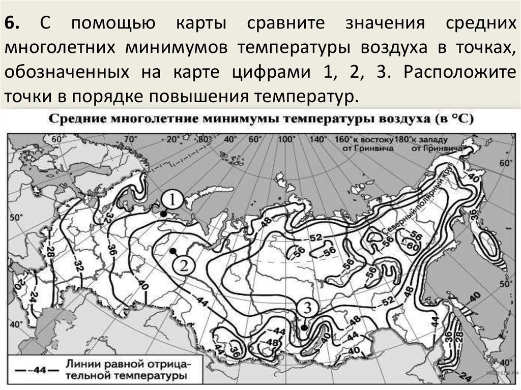 6. С помощью карты сравните значения среднихмноголетних минимумов температуры воздуха в точках,