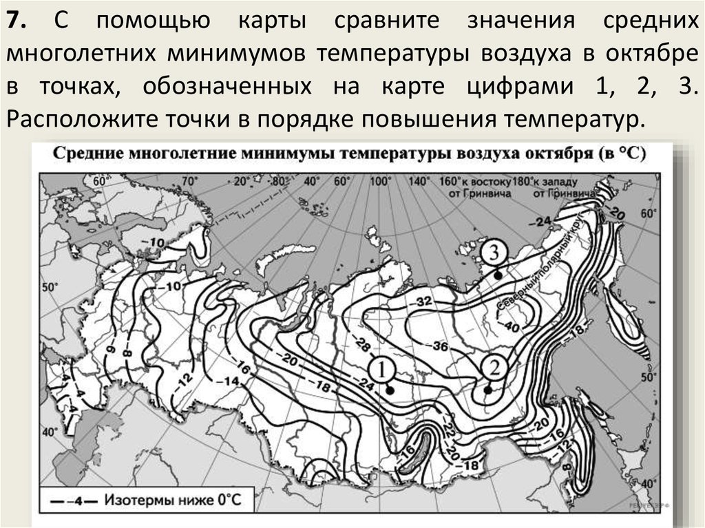7. С помощью карты сравните значения среднихмноголетних минимумов температуры воздуха в октябре