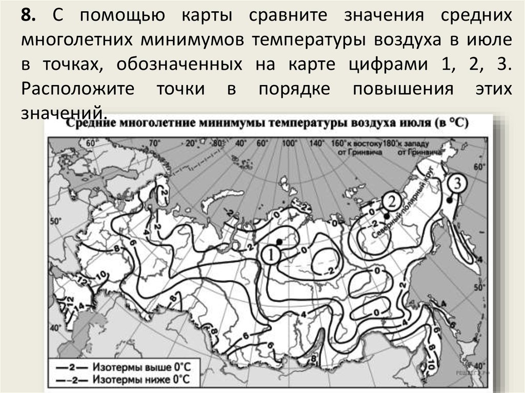 8. С помощью карты сравните значения среднихмноголетних минимумов температуры воздуха в июле