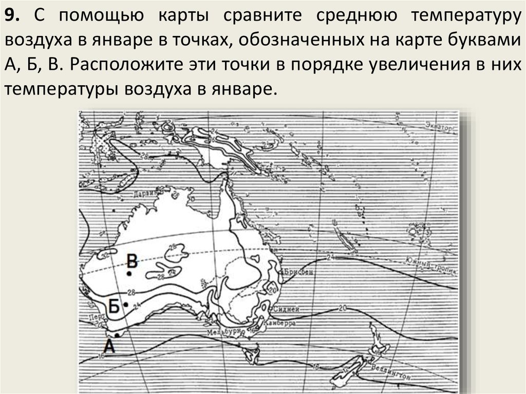 9. С помощью карты сравните среднюю температурувоздуха в январе в точках, обозначенных на карте буквами