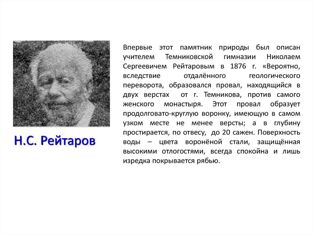 Н.С. РейтаровВпервые этот памятник природы был описан