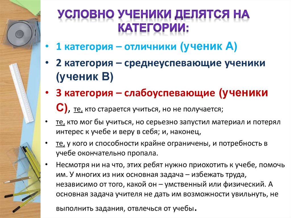 • 1 категория – отличники (ученик А)• 2 категория – среднеуспевающие ученики
