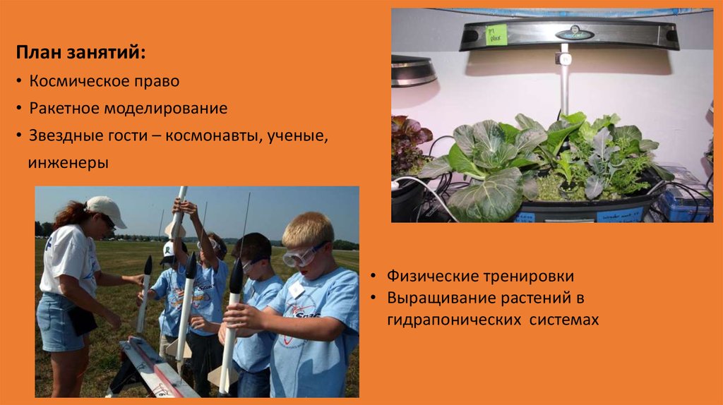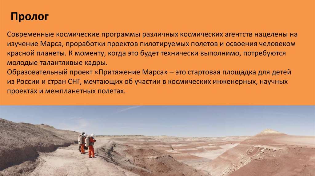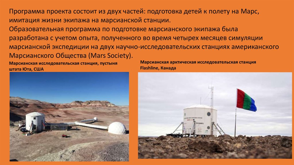 Программа проекта состоит из двух частей: подготовка детей к полету на Марс,имитация жизни экипажа на марсианской станции.
