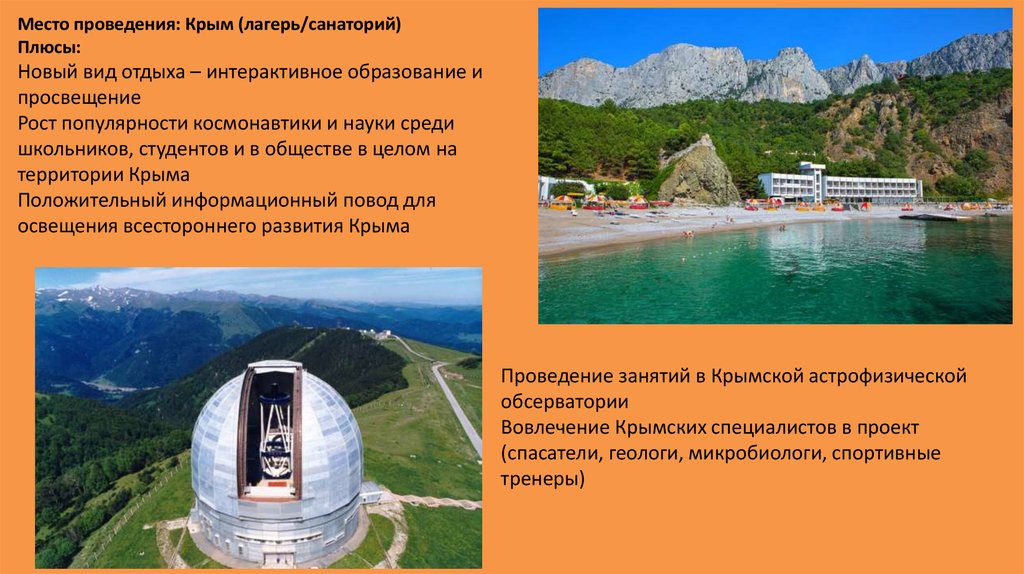 Место проведения: Крым (лагерь/санаторий)Плюсы: