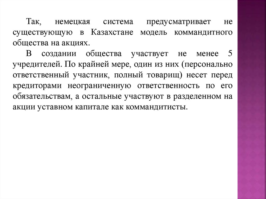 Так, немецкая система предусматривает несуществующую в Казахстане модель коммандитного