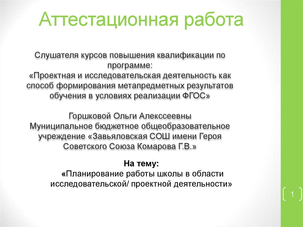Аттестационная работа. Планирование работы школы в области исследовательской/ проектной деятельности