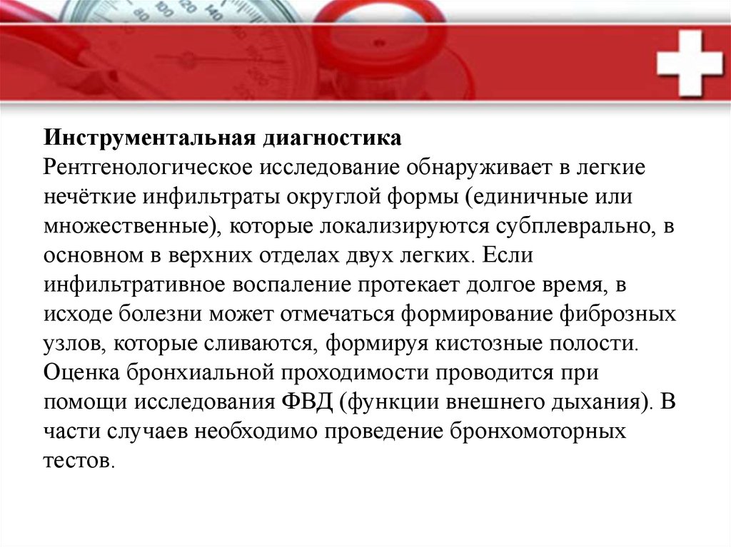 Инструментальная диагностикаРентгенологическое исследование обнаруживает в легкие