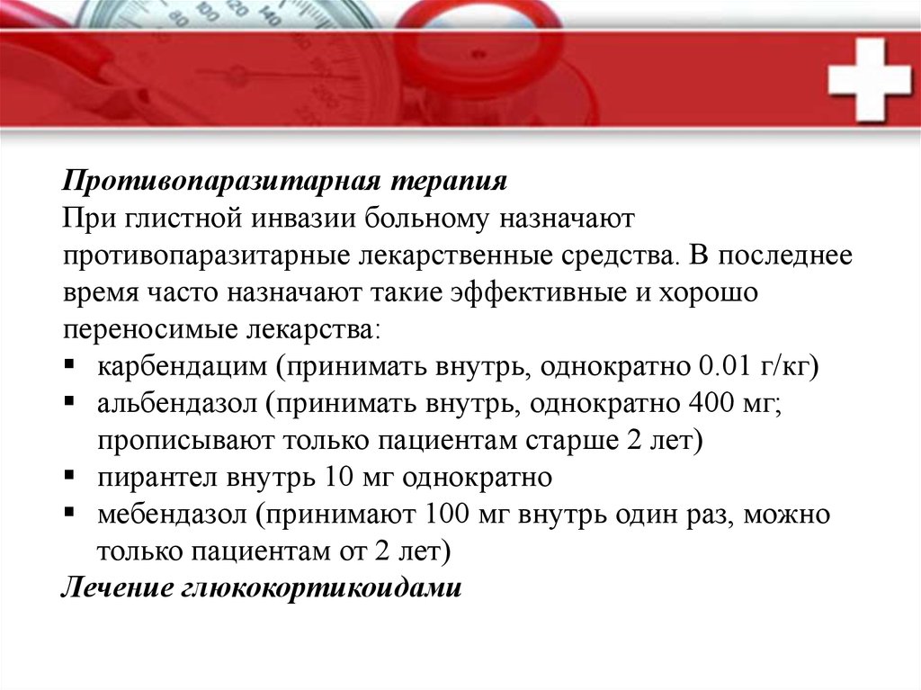 Противопаразитарная терапияПри глистной инвазии больному назначают