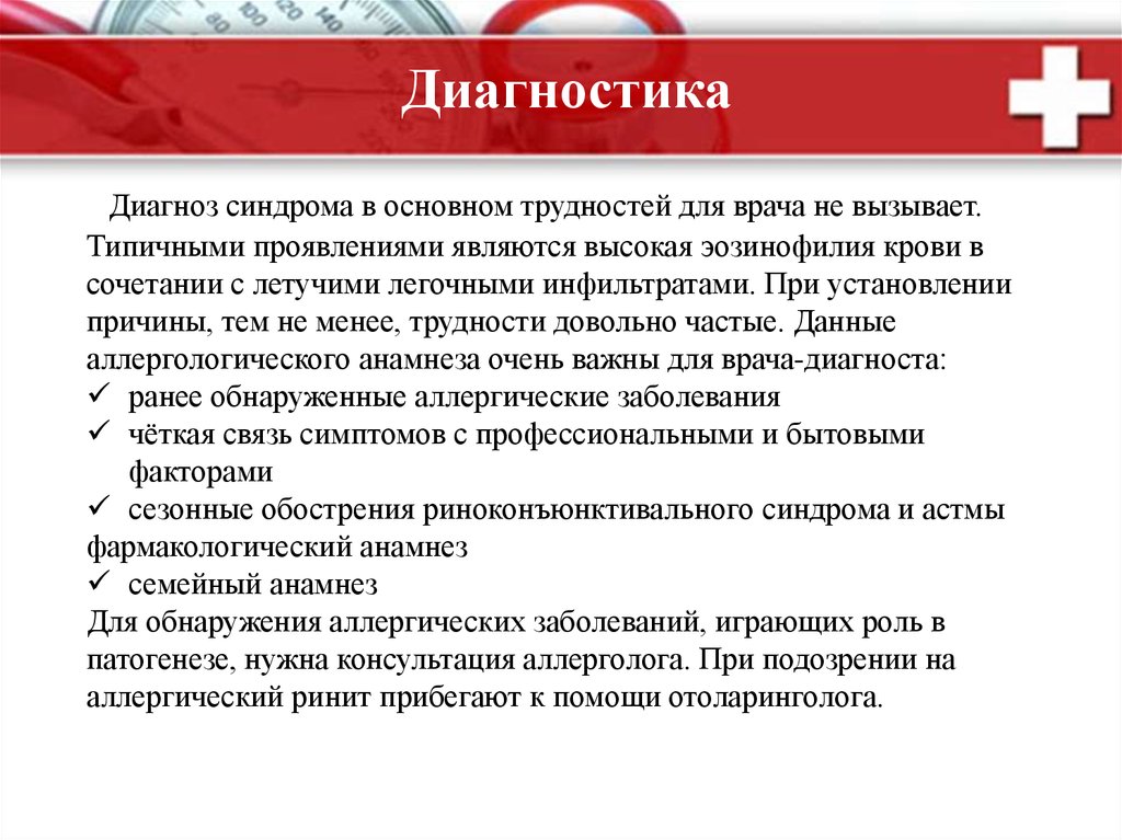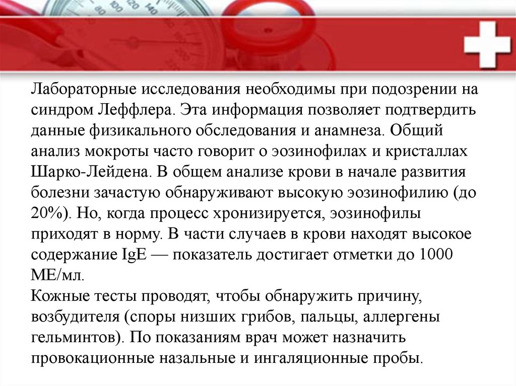 Лабораторные исследования необходимы при подозрении насиндром Леффлера. Эта информация позволяет подтвердить