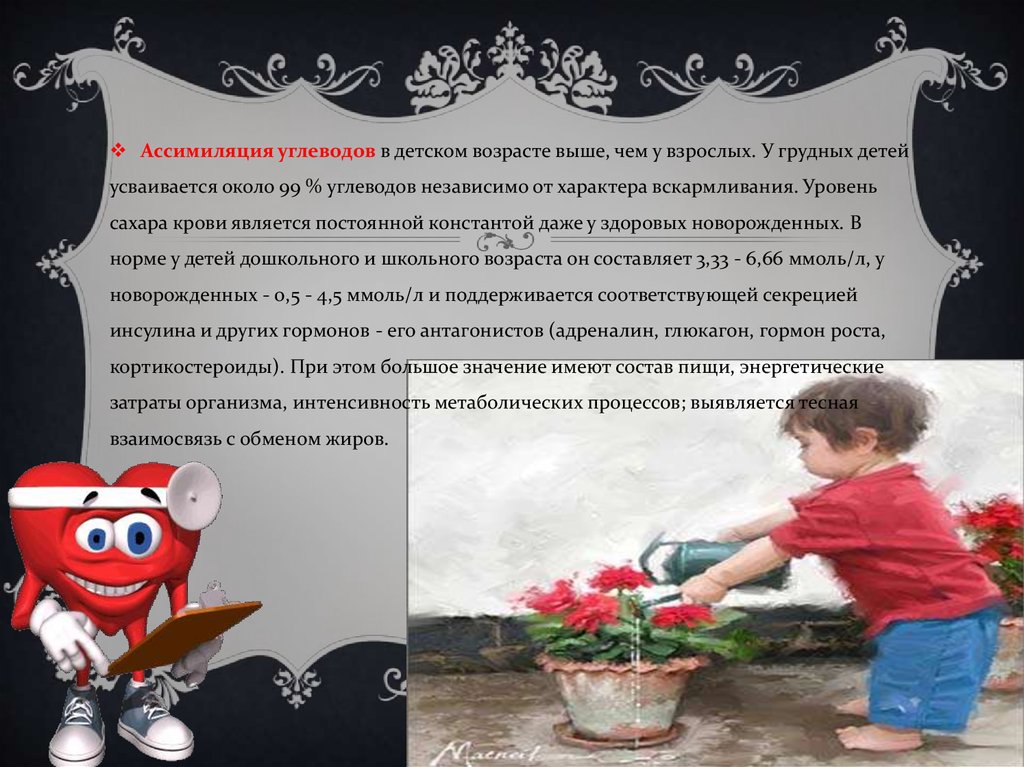 Ассимиляция углеводов в детском возрасте выше, чем у взрослых. У грудных детейусваивается около 99 % углеводов независимо от характера вскармливания. Уровень