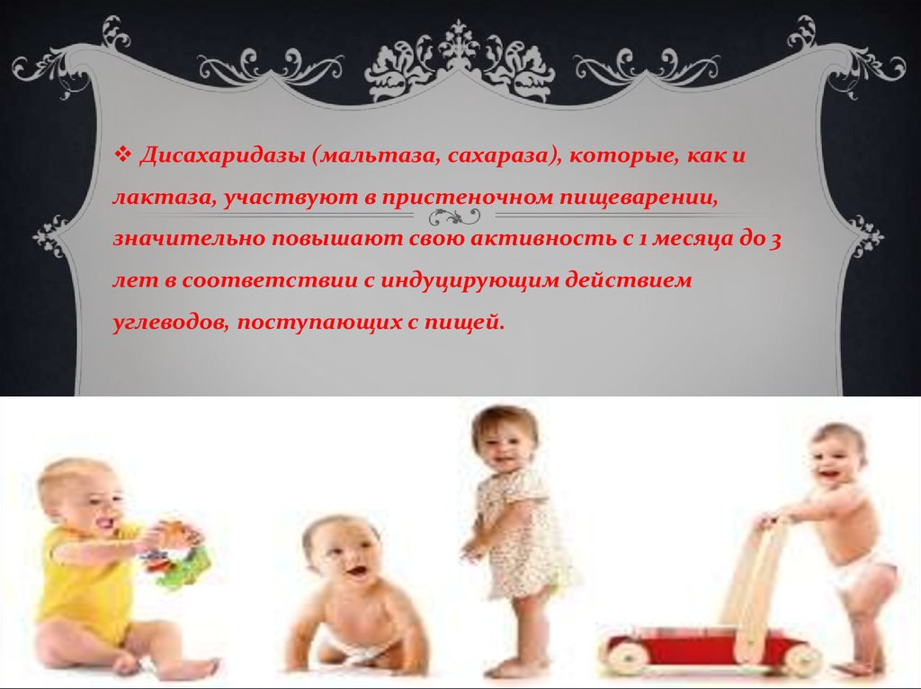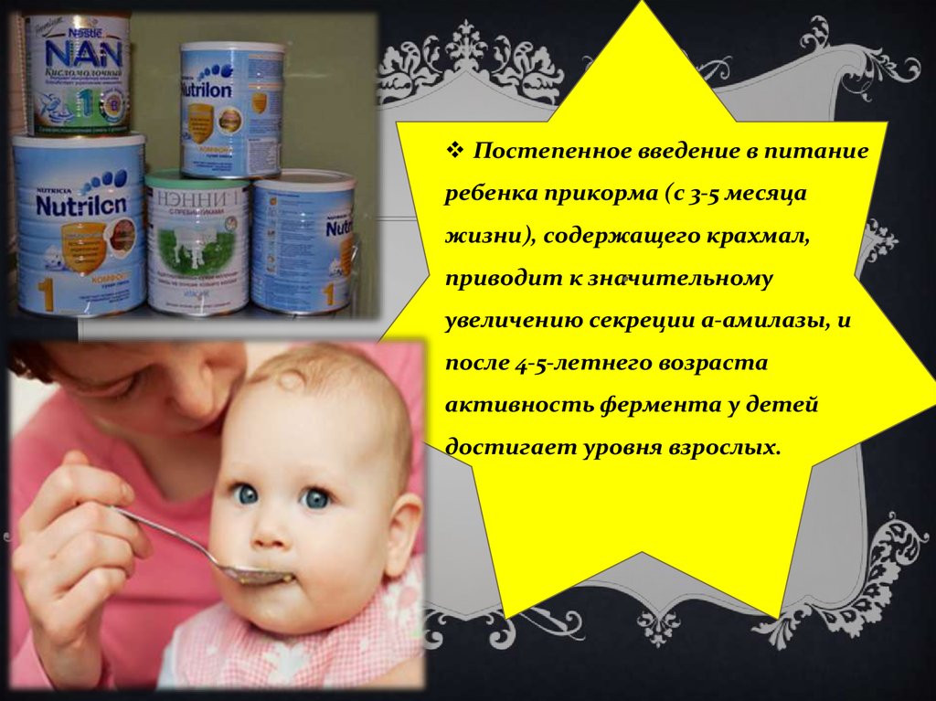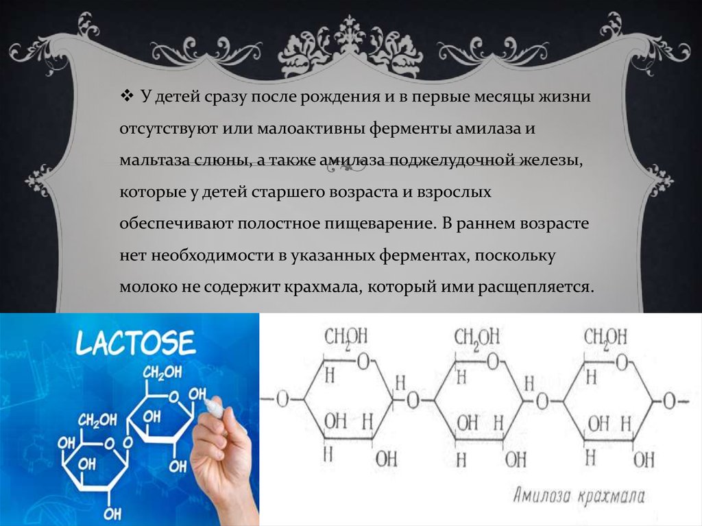 У детей сразу после рождения и в первые месяцы жизниотсутствуют или малоактивны ферменты амилаза и