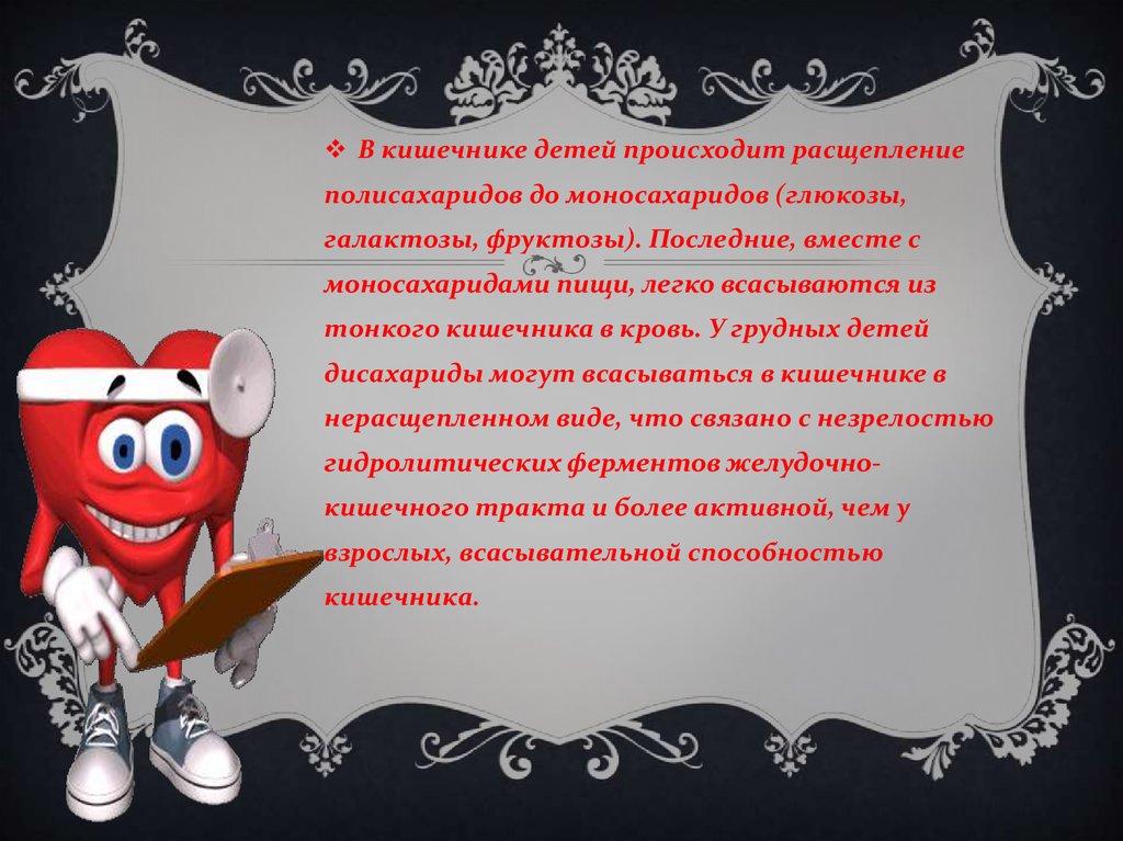 В кишечнике детей происходит расщеплениеполисахаридов до моносахаридов (глюкозы,