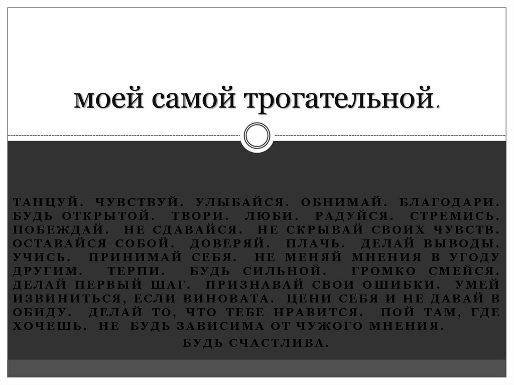 ТАНЦУЙ. ЧУВСТВУЙ. УЛЫБАЙСЯ. ОБНИМАЙ. БЛАГОДАРИ.БУДЬ ОТКРЫТОЙ. ТВОРИ. ЛЮБИ. РАДУЙСЯ. СТРЕМИСЬ.