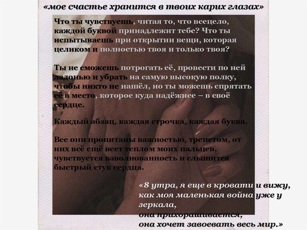 «мое счастье хранится в твоих карих глазах»Что ты чувствуешь, читая то, что всецело,