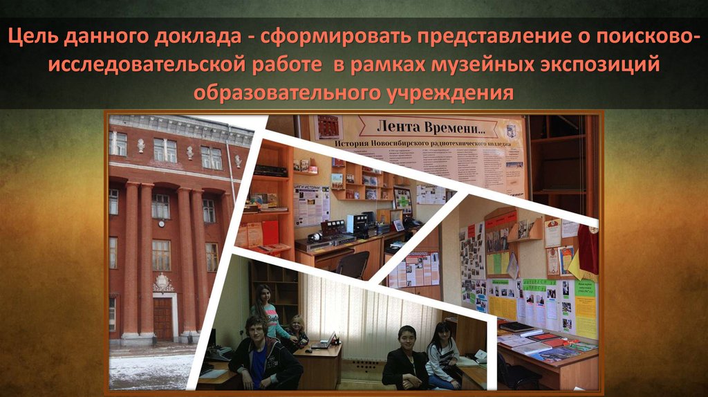 Цель данного доклада - сформировать представление о поисковоисследовательской работе в рамках музейных экспозицийобразовательного учреждения