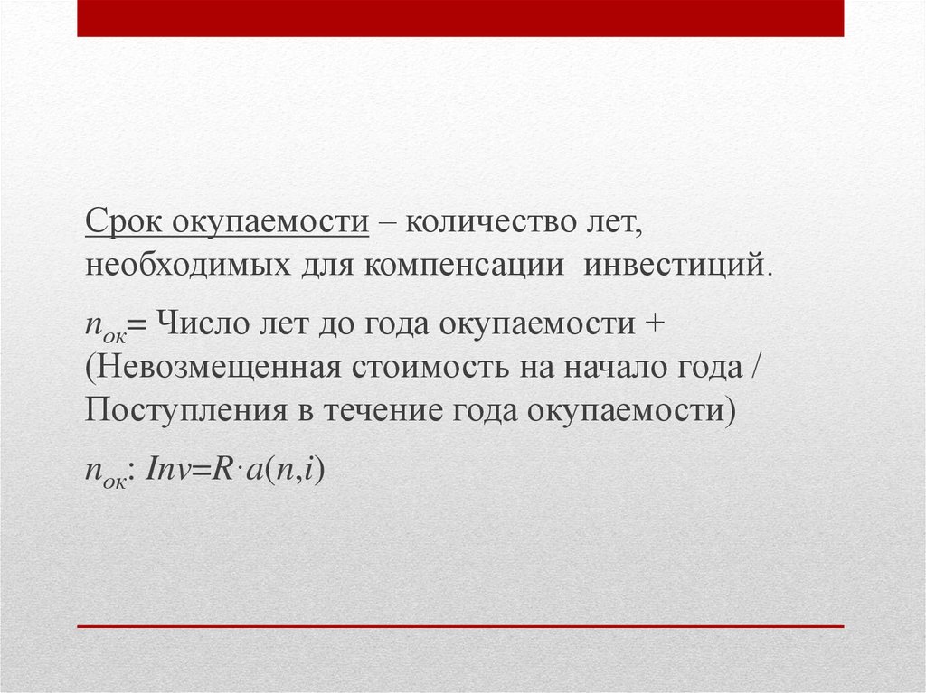 Срок окупаемости – количество лет,необходимых для компенсации инвестиций.