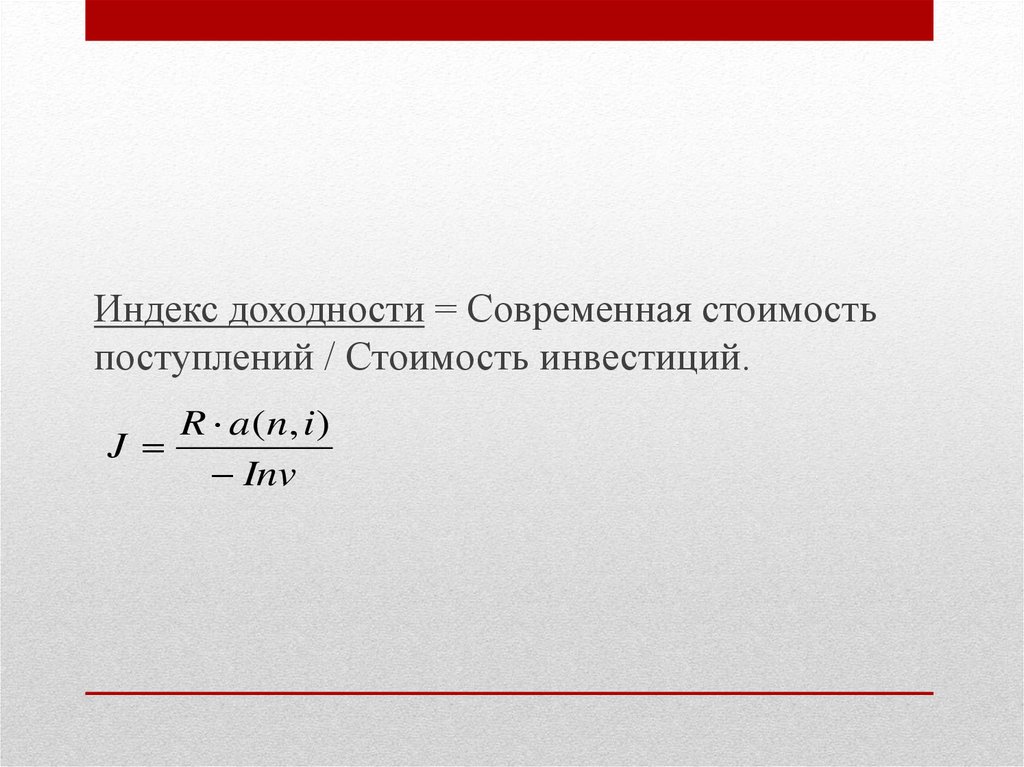 Индекс доходности = Современная стоимостьпоступлений / Стоимость инвестиций.